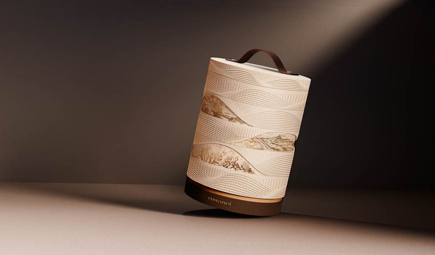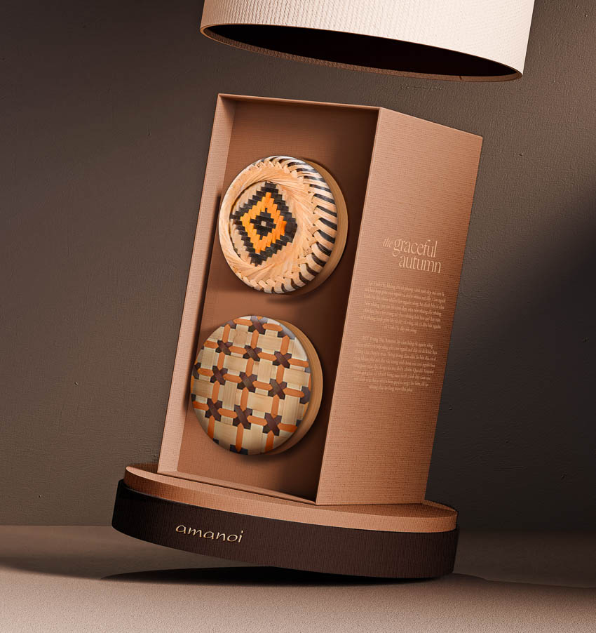 Điểm nhấn đầu tiên nằm ở thiết kế hộp: lớp áo bằng giấy bồi tạo hình uốn lượn như những nhịp sóng nhẹ, phía dưới là bức hoạ toàn cảnh bờ vịnh với Núi Chúa, biển cả và Amanoi; bên trong, phần hộp được làm thủ công bằng nan tre truyền thống. Hoạ tiết chủ đạo cách điệu từ chiếc “đó” đánh cá – vật dụng quen thuộc của cư dân miền biển – vừa gợi chuyển động của sóng, vừa tôn bật ý niệm bền vững và thủ công bản địa. Đây không chỉ là bao bì, mà là một vật phẩm kể chuyện, nơi thẩm mỹ tối giản gặp gỡ chất liệu địa phương, tạo nên cảm giác nâng niu ngay từ thao tác mở hộp.