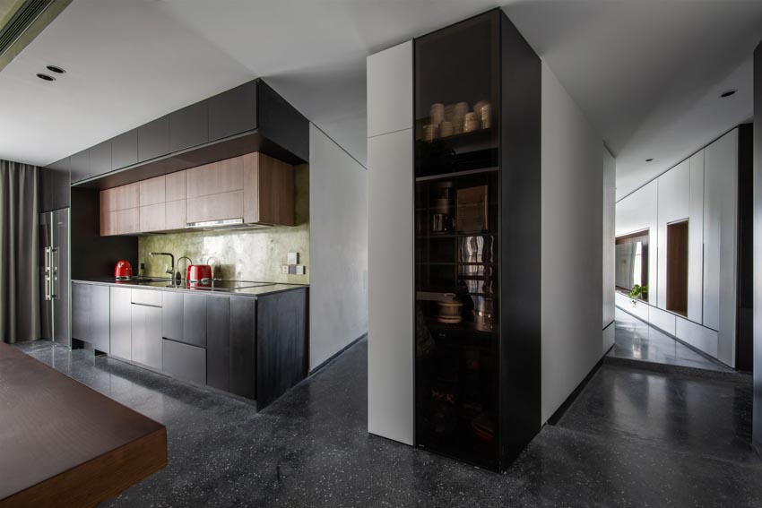 AO Apartment là một bản giao hưởng nhẹ nhàng của vật liệu tự nhiên và sự tinh tế. Terrazzo, sơn bột đá Vassari và gỗ Plywood là ba chất liệu chủ đạo, được lựa chọn không chỉ vì tính thẩm mỹ mà còn bởi khả năng “thở” – điều tiết độ ẩm, giúp căn hộ luôn khô ráo và dễ chịu trong điều kiện khí hậu đặc trưng của miền Bắc Việt Nam.