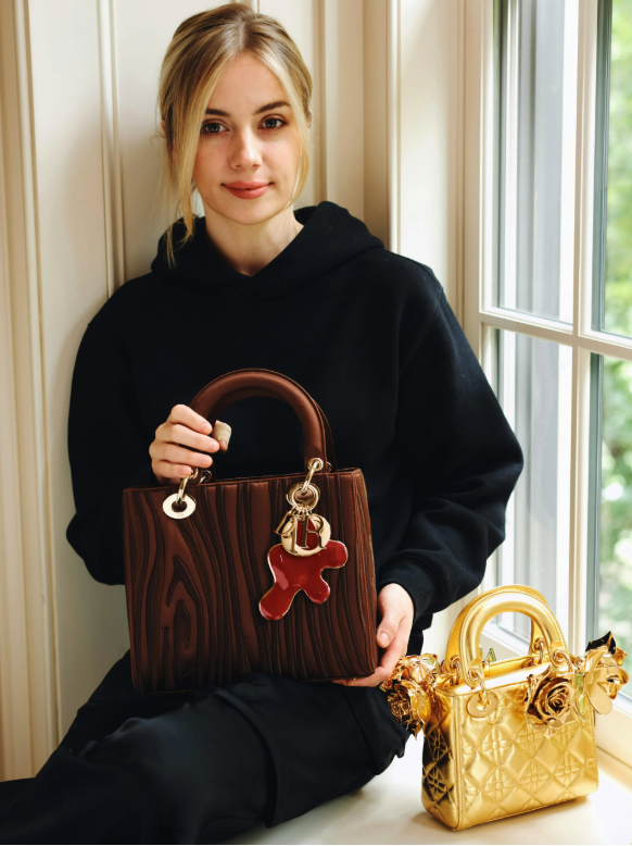 Nghệ sĩ Anna Weyant cùng hai thiết kế Lady Dior trong phiên bản gỗ và vàng ánh kim.
