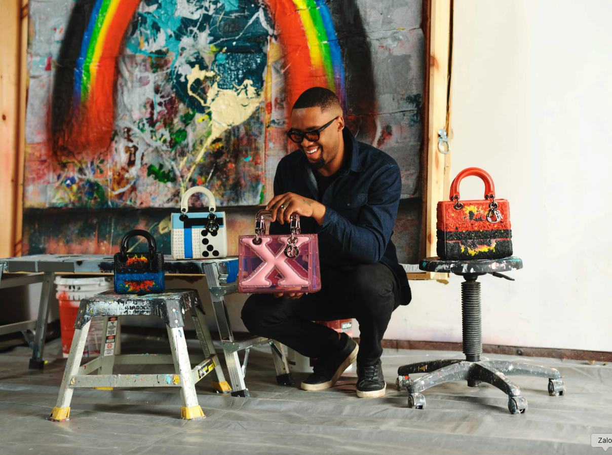 Nghệ sĩ Vaughn Spann trong xưởng vẽ cùng các thiết kế Lady Dior mang đậm ngôn ngữ hình học và sắc màu biểu cảm.