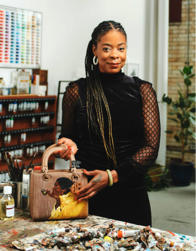 Nghệ sĩ Danielle McKinney cùng thiết kế Lady Dior khắc họa hình ảnh người phụ nữ da màu trong khoảnh khắc tĩnh lặng.