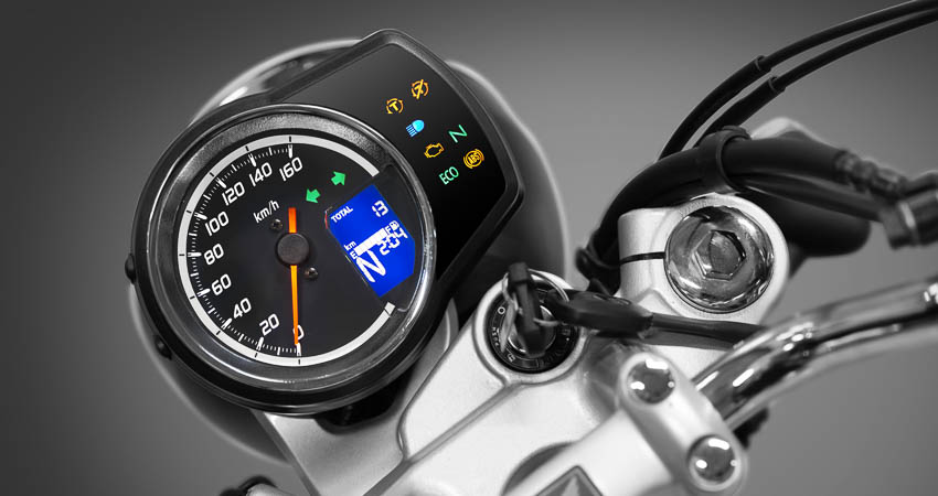 CB350 H’ness giữ tỷ lệ “đầu tròn – bình xăng bo – pô mạ sáng” đúng tinh thần classic, nhưng ngôn ngữ lại rất hiện đại: đèn LED tròn, xi-nhan LED vòng lửa, vành đúc 14 chấu đi kèm lốp không săm to bản. Khoang lái là sự đối thoại giữa analog và digital: đồng hồ kim tốc độ kết hợp màn LCD đa chức năng (xăng, giờ, số, tiêu thụ nhiên liệu tức thời/trung bình, điện áp bình, quãng đường có thể đi…). Yên phẳng – rộng, đặt người lái vào đúng “tư thế H’ness”: thư thái nhưng luôn sẵn sàng cho cú vặn ga tiếp theo.