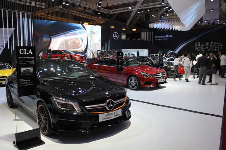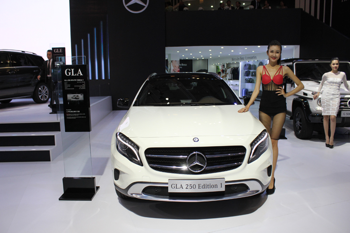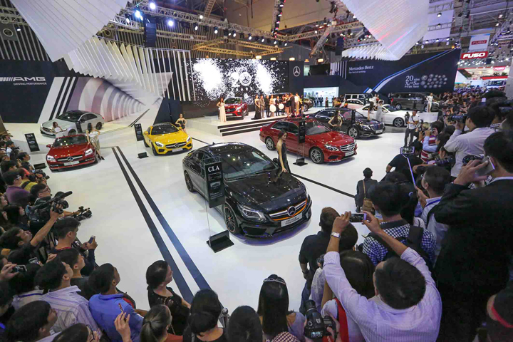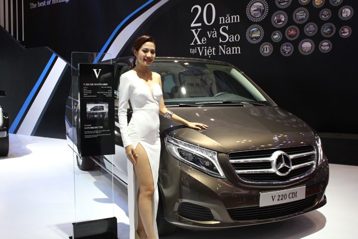 Với thông điệp “Modern Luxury in Motion”, gian hàng của người khổng lồ Mercedes-Benz không chỉ làm choáng ngợp giới truyền thông bởi sự hoành tráng về sự rộng lớn của sân khấu cùng với 12 mẫu xe đẳng cấp mà nơi đây còn thu hút mọi đám đông bởi sự hiện diện của dàn sao showbiz cùng màn trình diễn nghệ thuật mang đẳng cấp trên nền chuyển động của những thanh điện tử trắng chuyển động liên tục trong tạo nên hiệu ứng của sự hiện đại và đầy công nghệ. Vẫn với những màn nghệ thuật độc đáo và dàn khách hàng nổi tiếng, màn trình diễn trên sân khấu của MBV luôn là tâm điểm của mọi sự quan tâm. Ngôi sao cho màn trình diễn của ông lớn thương hiệu Mercedes-Benz năm nay là hai mẫu SUV hạng sang GLE 450 AMG Coupe và GLE 400 Exclusive, nhưng mẫu E 250 AMG Edition 20 mới chính là mẫu xe đánh dấu kỷ niệm 20 năm thương hiệu ngôi sao 3 cánh có mặt tại thị trường Việt Nam. Màn trình diễn duy nhất kết thúc ấn tượng trong không khí của một buổi tiệc sinh nhật với bài hát Happy Birthday dành tặng cho sinh nhật MBV vang khắp không gian triển lãm.
