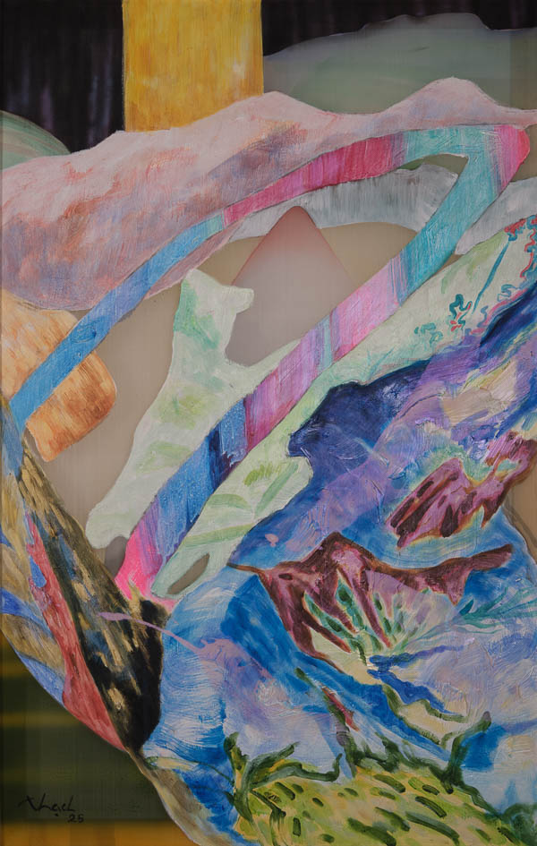 Những truyền thuyết về Thần Núi, Thần Rừng, Thần Sông… trở thành chất liệu khởi phát, nhưng không nhằm tái dựng, mà để tái cảm nhận. Trên nền lụa trong suốt, mềm như khói, Thạch đặt vào đó những đường cắt lạnh như thép – những mảnh sắc chạm vào da thịt. Sự tương phản ấy – thanh và sắc, tĩnh và động, hợp và tan – chính là ngôn ngữ thị giác của anh: nơi thiêng liêng không còn ở chỗ xa xôi, mà ngay trong ranh giới mong manh giữa tin và ngờ.