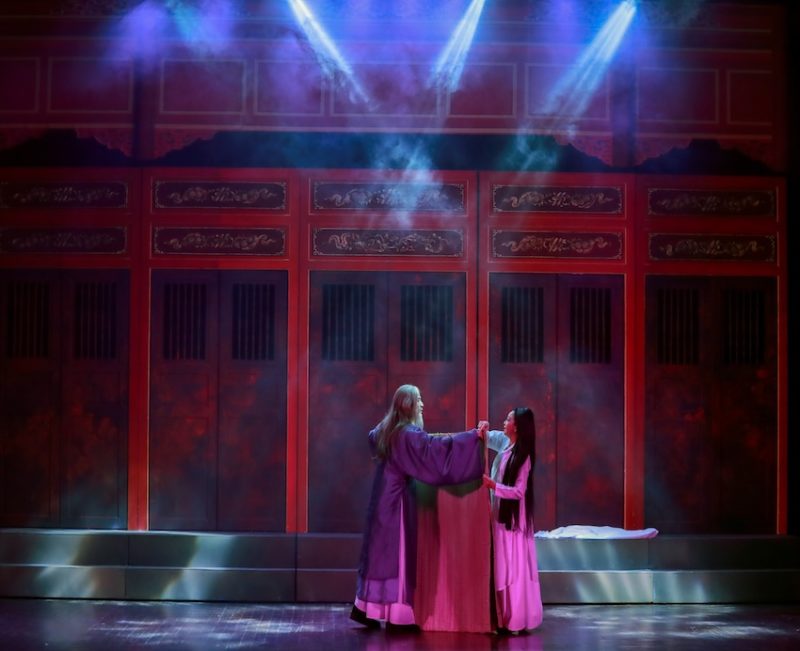 Không cầu kỳ. Không thừa thãi. Mỗi đạo cụ xuất hiện trên sân khấu như một ký hiệu, có khi là tấm rèm, hương trầm, một vệt sáng giữa bóng tối – vừa thực, vừa biểu tượng. Cảm xúc sân khấu được dẫn dắt bởi ánh sáng, khi thì lạnh lẽo trong cơn bẽ bàng, khi thì đỏ rực như con giận dữ của oan trái.