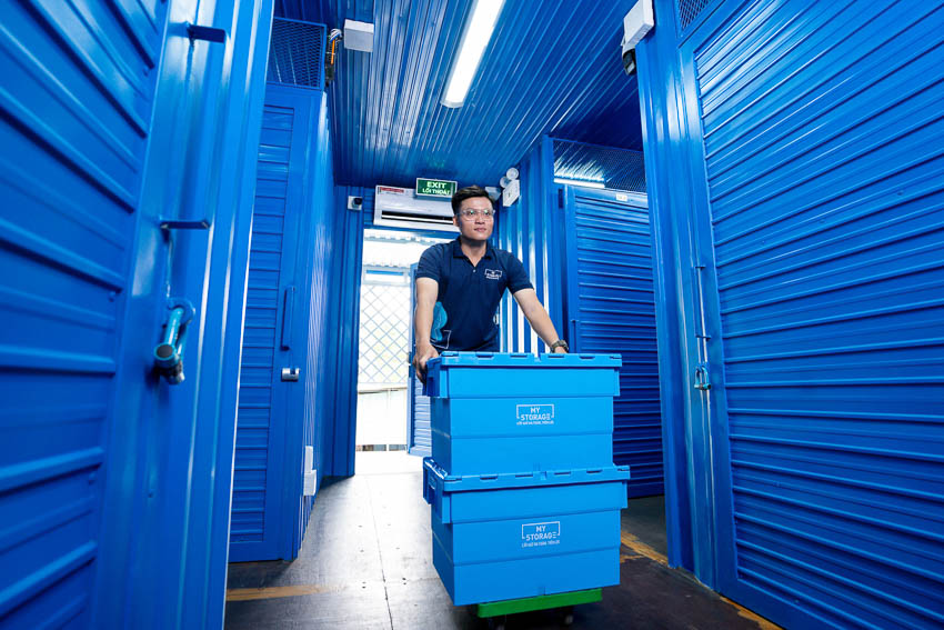 Nhân viên MyStorage vận chuyển hàng hóa trong khu vực kho tự quản tại TP.HCM. Các khoang lưu trữ được thiết kế hiện đại, an toàn, kiểm soát nhiệt độ và độ ẩm.