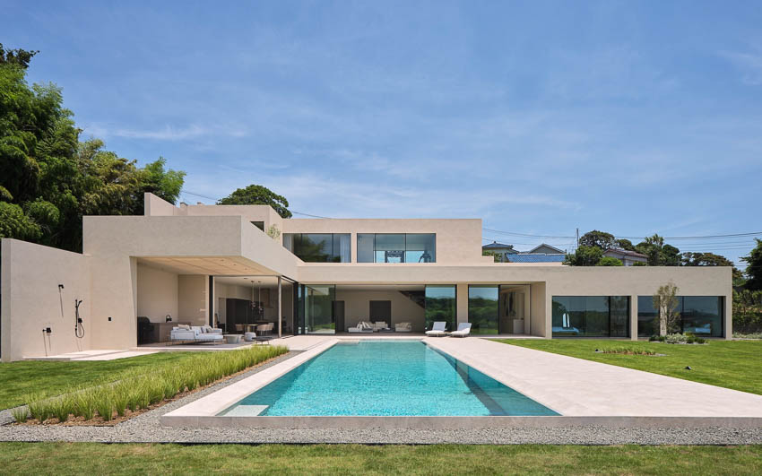 Nằm ở rìa một khu dân cư, nơi mùi muối biển hòa lẫn trong gió và âm thanh sóng vỗ phảng phất ngoài xa, ngôi nhà này như đang thì thầm cùng thiên nhiên. Chủ nhân — một cặp vợ chồng Nhật – Mỹ — tìm đến đây không phải để ẩn mình, mà để tìm lại cảm giác sống trong sự yên tĩnh mà thế giới hiện đại đã lấy mất.
