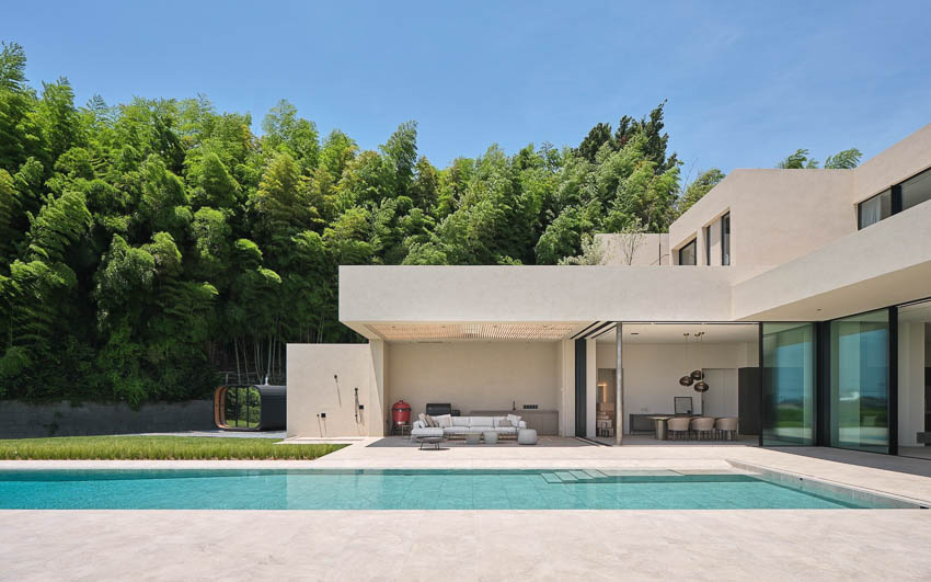 Trung tâm ngôi nhà là một hồ bơi dài 20 mét, sâu 2,5 mét, mặt nước hướng thẳng ra vườn quýt phía Nam. Ánh sáng chiếu lên mặt nước, phản xạ lên trần nhà, tạo thành những gợn sóng của không khí. Người ta nói, ngôi nhà này có nhịp thở riêng, và nhịp ấy bắt đầu từ bề mặt lấp lánh của hồ bơi.