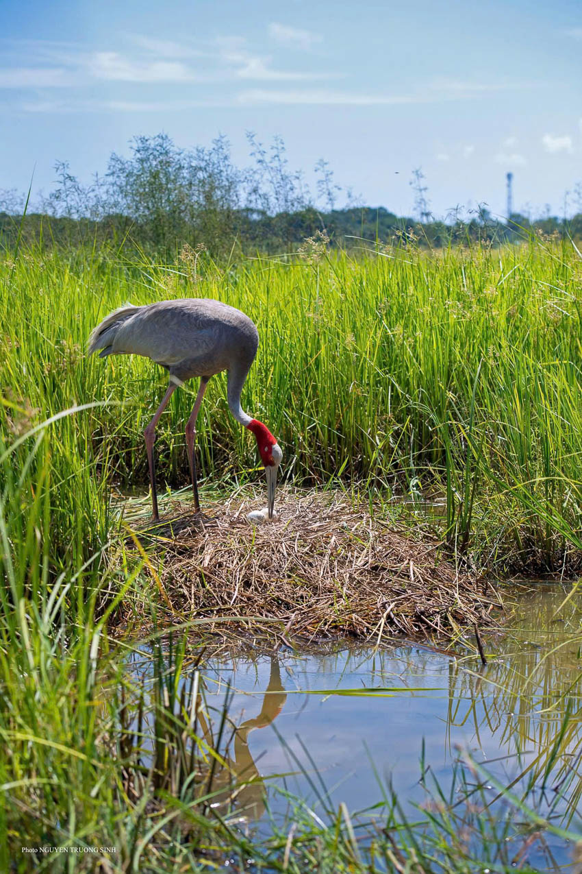 Sếu đầu đỏ – loài chim cao lớn, cổ xưa như thể bước ra từ thời tiền sử – từng hiện diện khắp vùng Đồng Tháp Mười, gắn với tiếng kêu vang vọng giữa mùa nước nổi. Nhưng rồi, khi đất bị chia cắt, đầm lầy khô cạn, chúng biến mất. “Tôi đi tìm lại bóng dáng của chúng, như đi tìm lại một phần ký ức của đồng bằng,” Nguyễn Trường Sinh chia sẻ trong một cuộc trò chuyện.