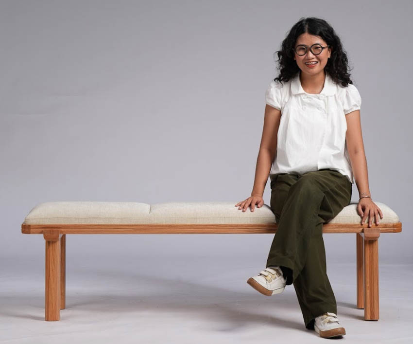 Crossline Bench, tác phẩm đạt Giải Ba của Hồ Thị Thu Hà, tái hiện một Việt Nam hiện đại đang chuyển động. Các nhịp cầu của Sài Gòn – hướng về tương lai – được thu lại trong những đường giao tuyến bằng gỗ sồi đỏ Mỹ. Vật liệu cứng, ổn định giúp duy trì độ sắc sảo của đường thẳng nhưng vẫn giữ được độ dịu mắt nhờ thớ gỗ ấm, tạo nên sự cân bằng giữa công nghiệp và tự nhiên.