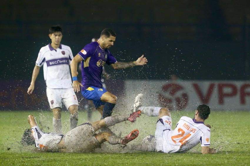 Trận đấu tâm điểm giữa Becamex TPHCM và CLB Hà Nội trên sân Gò Đậu tối qua đã diễn ra trong điều kiện thời tiết cực kỳ khắc nghiệt, biến sân cỏ thành một “thủy chiến” đúng nghĩa. Dù thời tiết gây ảnh hưởng lớn đến chất lượng chuyên môn, nhưng kịch tính và những diễn biến bất ngờ, đặc biệt là sự xuất hiện của 3 quả phạt đền, đã khiến khán giả mãn nhãn.