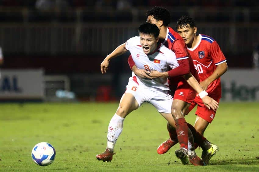 Trận đấu lượt về giữa tuyển Việt Nam và Nepal tối 14/10 đã diễn ra với nhiều khó khăn. Do ảnh hưởng của mưa lớn, trận đấu phải lùi lại 30 phút và bắt đầu lúc 20 giờ. Dù trời đã tạnh, nhưng mặt sân trơn trượt đã gây không ít trở ngại và tiêu hao thể lực đáng kể của các cầu thủ.