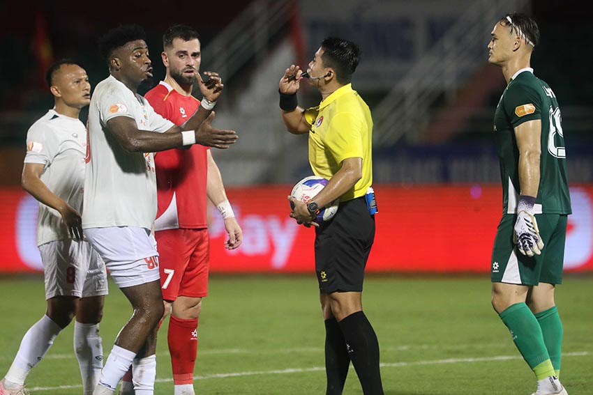 Phút cuối cùng của hiệp 1, một tình huống lộn xộn diễn ra trước khung thành thủ môn Lê Giang. Trọng tài chính Nguyễn Văn Phúc ban đầu đã thổi phạt đền 11m cho HLHT khi cho rằng bóng chạm tay một cầu thủ CATPHCM. Tuy nhiên, khi các cầu thủ đội khách đã sẵn sàng thực hiện quả đá phạt, Tổ VAR đã vào cuộc. Sau khi xem lại băng hình, trọng tài Văn Phúc đã thay đổi quyết định, xác định bóng chỉ chạm vai cầu thủ CATPHCM, từ chối quả phạt đền. Quyết định này đã gây ra phản ứng dữ dội từ phía các cầu thủ và ban huấn luyện HLHT.