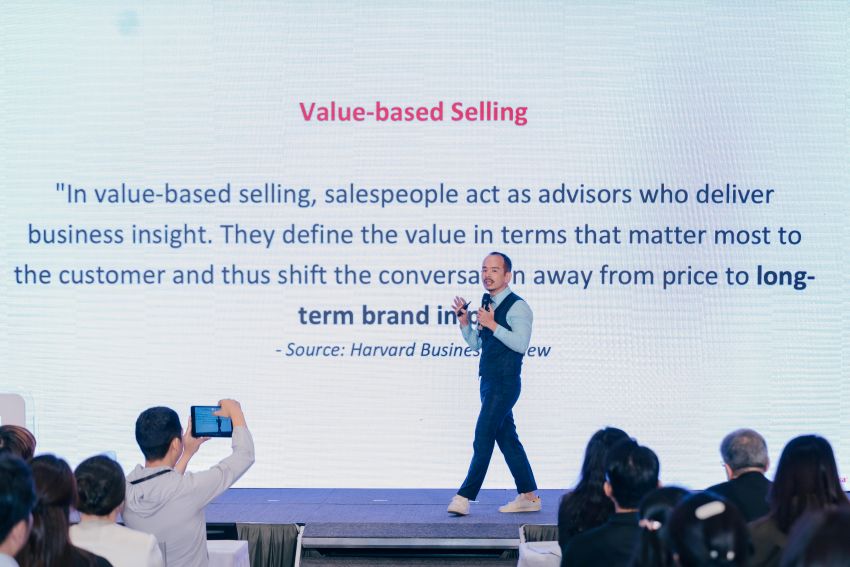 Tiếp nối, ông Lâm Bình Bảo – Founder B Coaching, với bài tham luận “AI trong B2B Sales”, minh họa tiến trình chuyển hóa của doanh nghiệp từ bản năng đến trí tuệ. Ông ví von: “Muốn vươn xa, doanh nghiệp không thể chỉ dựa vào nhân khí, mà phải dựa vào hệ thống – vì chỉ hệ thống mới ở lại, ngay cả khi con người ra đi.”